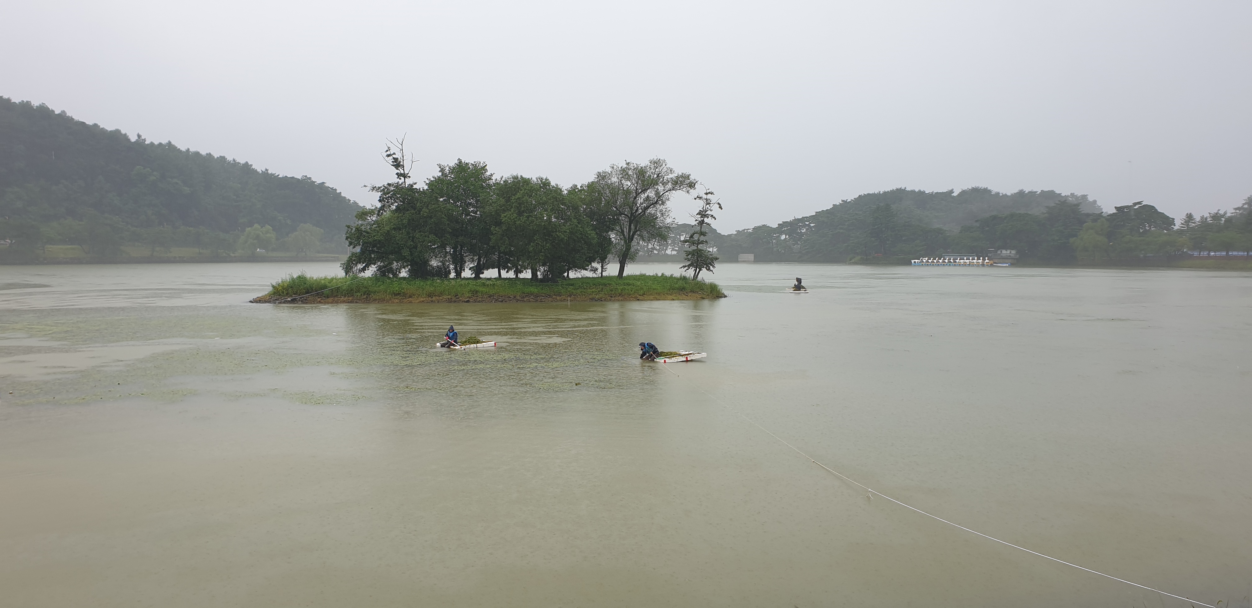 지난 휴가때 한창 비 많이 올때 갔더니 연못에 수초를 건지는 작업을 비가 많이 오는데도 하고 있더라구요